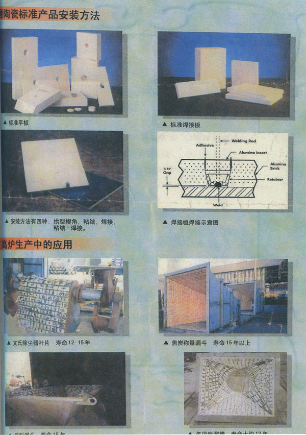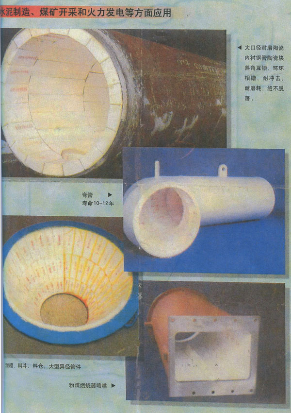 耐磨陶瓷产品(如耐磨陶瓷衬板)已经广泛应用于冶金工业.水泥制造.煤矿开采和火力发电等方面。特别是高炉生产,烧结和焦化过程中的易磨损环节,如溜槽、料仓、高炉顶布料系统、旋风除尘器、管道内衬、漏斗、粉煤喷吹管、条筛和蓖板, 其特点如下: